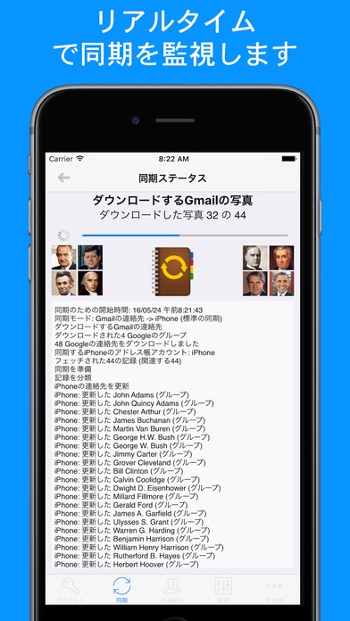 同期中はリアルタイムで同期作業のログを確認することができるので、抜け漏れがないかしっかり自分の目でチェックできます。同期が終われば「同期完了!」と表示されるので、これでOK!あとは思い通りに連絡先が同期されているか確認してみてください。