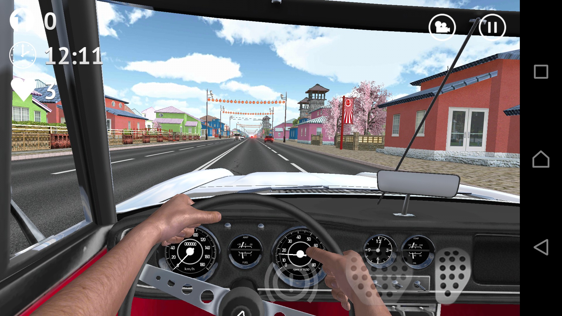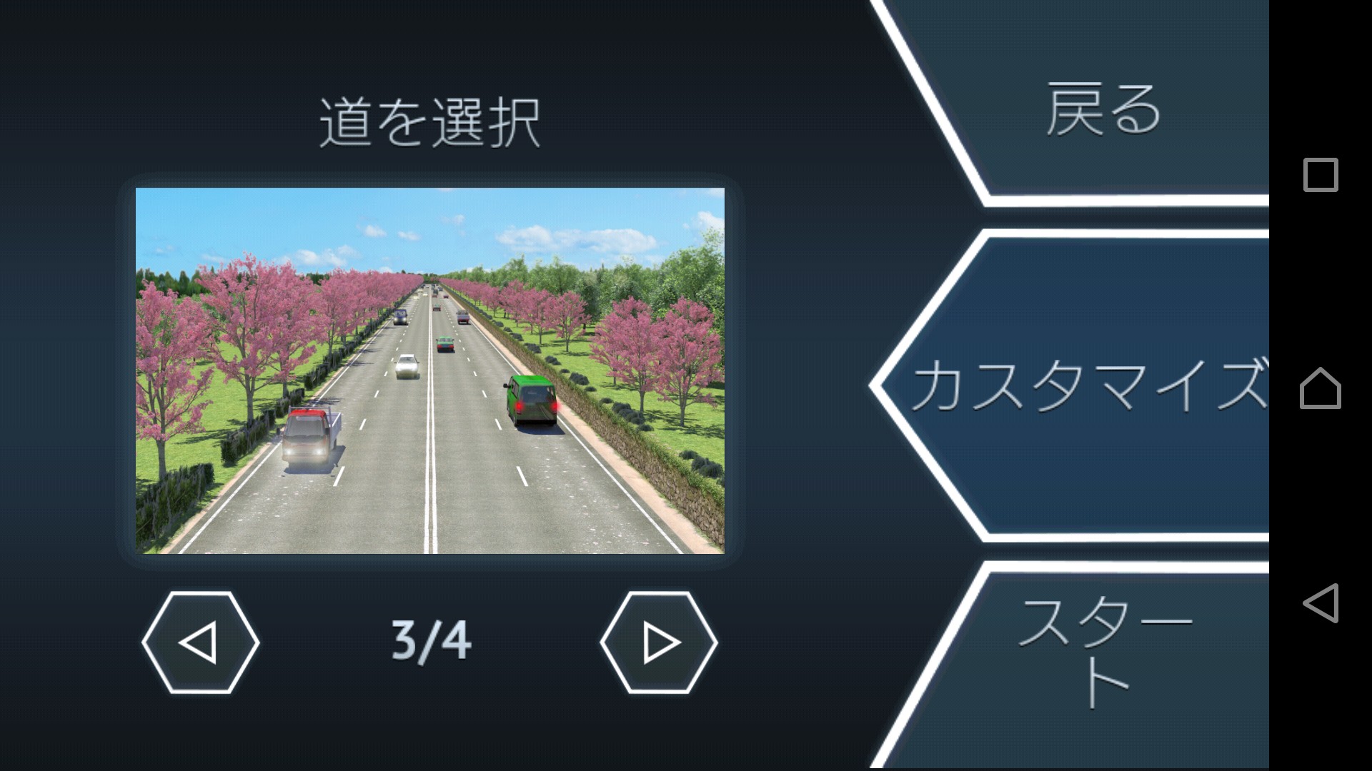 どこまでもまっすぐな道を、他の車をかわしながら、エンジン音とともにどこまでも走り抜けます。爽快感がたまりません。また、画面右上のビデオカメラのアイコンをタップすると、画面表示を車内か外側かに切り替えることができます。