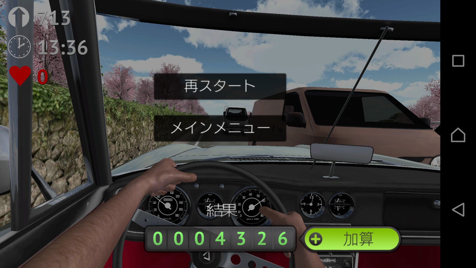 画面左下にアクセルとブレーキがあり、ハンドルはスマートフォンを傾けることで切ることができます(操作については設定から変更可能です(後述))。アクセルを踏み込むと、心地良いエンジン音が響きます。このエンジン音は、車ごとに異なっているそうです。レビューでも評価の高かったポイントでした。