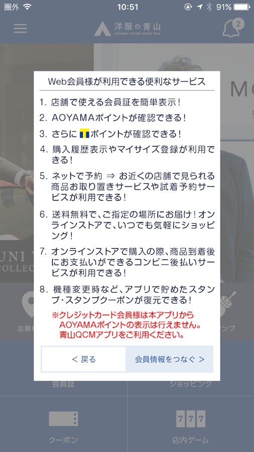 洋服の青山アプリを登録すると、会員情報を連携することができます。