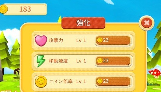 ゲットしたコインを使い、攻撃力、移動速度、コイン倍率のレベルをアップしていきます。