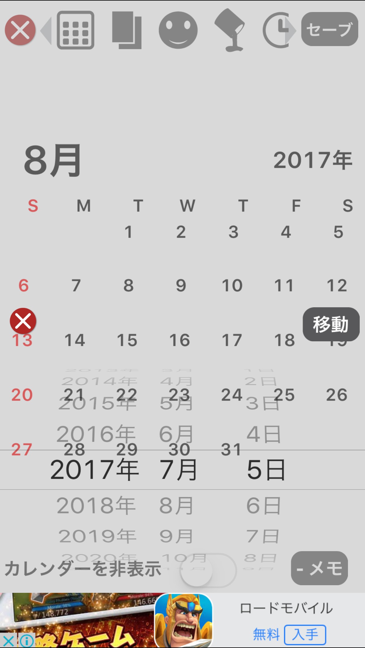 手順3.日付およびメモを入力して「セーブ」ボタンをタップ