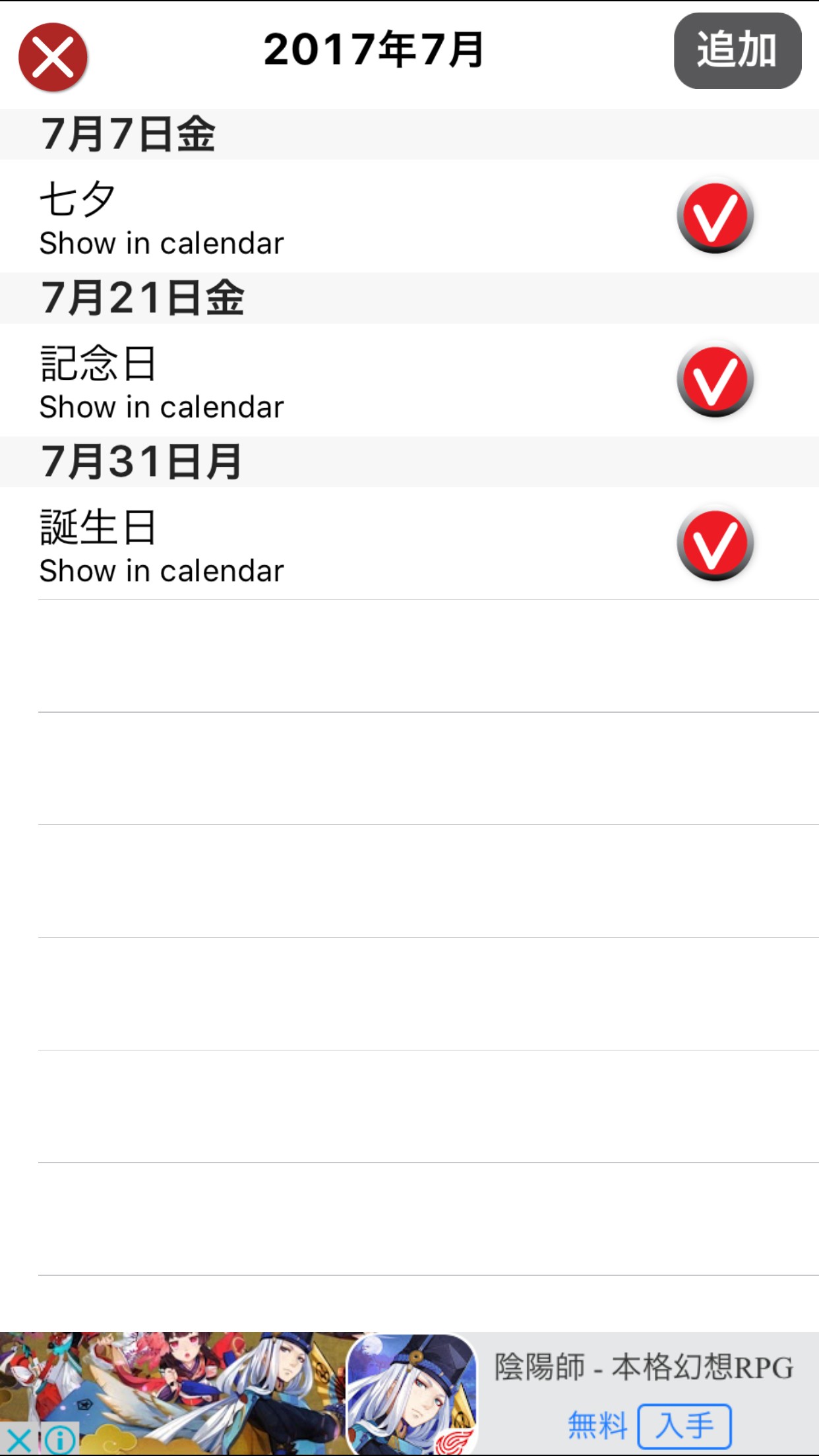 手順1.アプリを起動(または左上の×ボタン)で開く初期画面で「追加」ボタンをタップし、新しいカレンダーの編集画面を開く