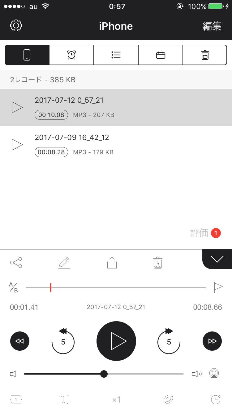 再生スピードの変更、受話器から録音内容を聴く、カレンダーから録音ファイルを探す、指定時間で再生停止、リピート&ランダム再生、共有などとても豊富な機能が備わっています。