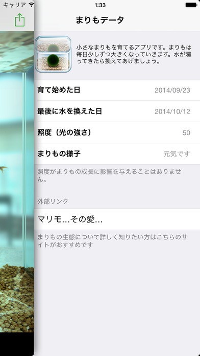 また、水槽の様子を撮影したり、TwitterやFacebookなどのSNSにシェアすることができたりしますので、使い方次第でまりもの観察日記なども付けることが出来ますよ!!