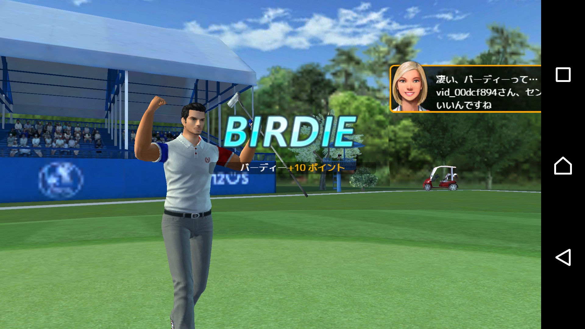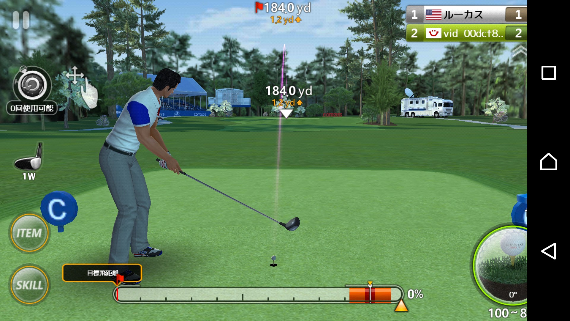 ゲージの左まで大きくインパクトガイドを振って一度タップ。これでショットの強さが決まります。戻ってきたガイドを赤いゲージに合わせてもう一度タップ。狙うはパーフェクトショットです。とはいえ、そこはリアルなゴルフゲーム、風向きなどによってグリーンに乗るまで打ち続けます。