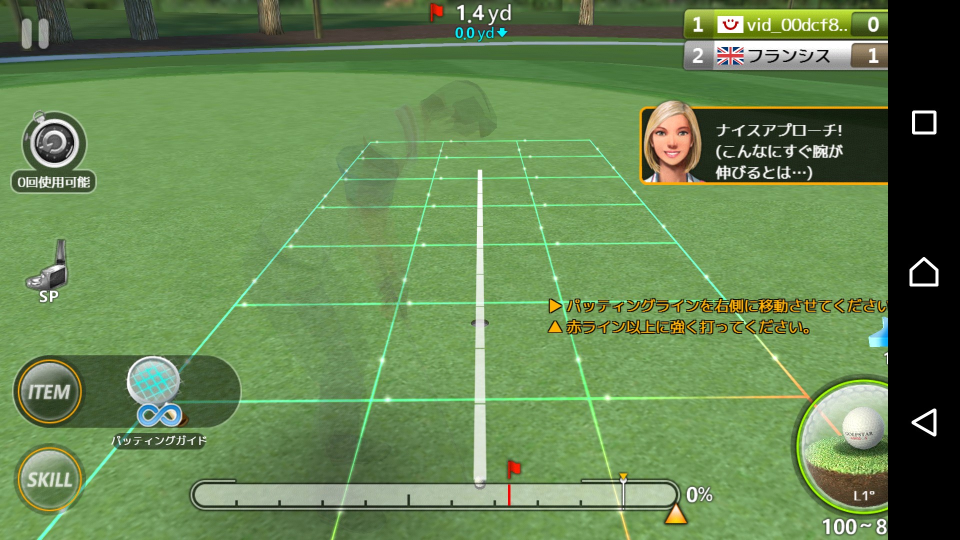 グリーンに乗ったら、パットにうつります。芝目などが表示されていますが、まずビギナーとしては、画面左の「パッティングガイド」を活用しましょう。まっすぐ打ったときに転がる方向を示す水色のラインが表示されますので、それに逆らうように反対向きにガイドを移動させましょう。プレイヤーのランクが上がると無料では使用できなくなりますので、今のうちにたくさん使ってパッティングのコツを覚えておきましょう。