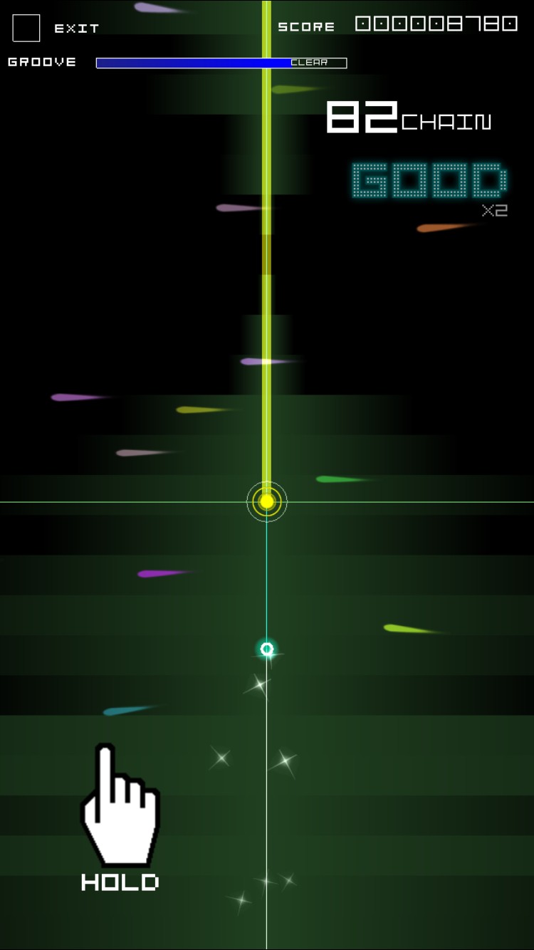 暗闇の中に一本の線があり、そこに丸い物体が走っています。走っていると、物体とターゲットと呼ばれる丸い物が重なる時があります。音楽に合わせながら、重なった時に、アクションする、というゲーム内容です。アクションは様々で、タッチするだけ、長押し、指をスライドさせる、タッチの連打などがあります。