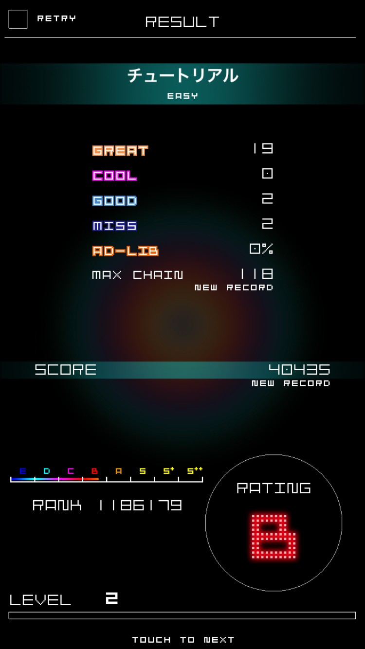 曲が終わると、総合評価が表示されます。D〜S++まで8段階で表示されます。自分がどれくらいのレベルなのか分かります。またそれとは別に1度もミスせずに、ゲームをクリアすると「NO MISS」、アドリブを含むすべてのチェインを成功させると、「FULL CHAIN」のバッヂがもらえます。