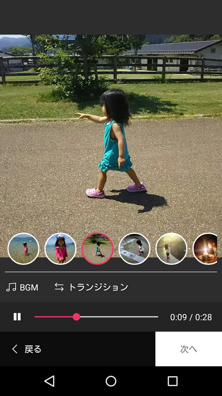 シーンの順番を入れ換えたり削除したりも感覚的に操作できてとても簡単です。BGMをつけたり、動画の始まりと終わりを白く飛ばすトランジションなどの効果を付けることもできます。BGMはあらかじめ用意されているものを使うもよし、スマホの中に音楽データが入っていれば、その楽曲を使うこともできます。もちろん、編集したり加工したりした動画を保存しておいて、後からさらに映像を追加したり、シーンを削除したり、BGMを変更したりなども自由自在です。