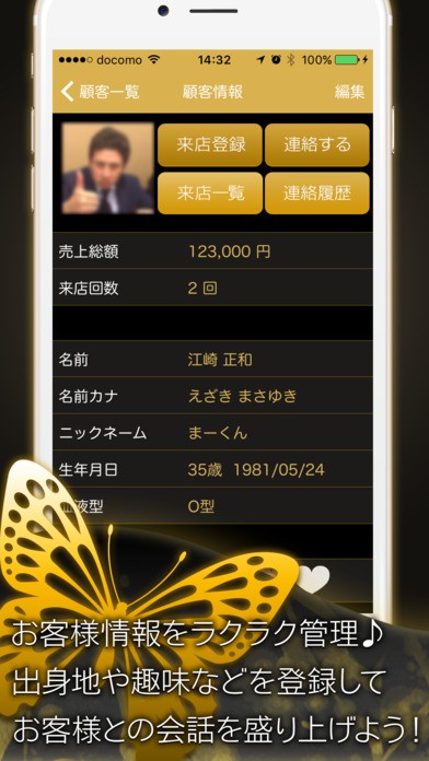 さらに登録した顧客情報には”来店登録”、”来店一覧”、”連絡する”、”連絡履歴”と詳しく入力することができます。