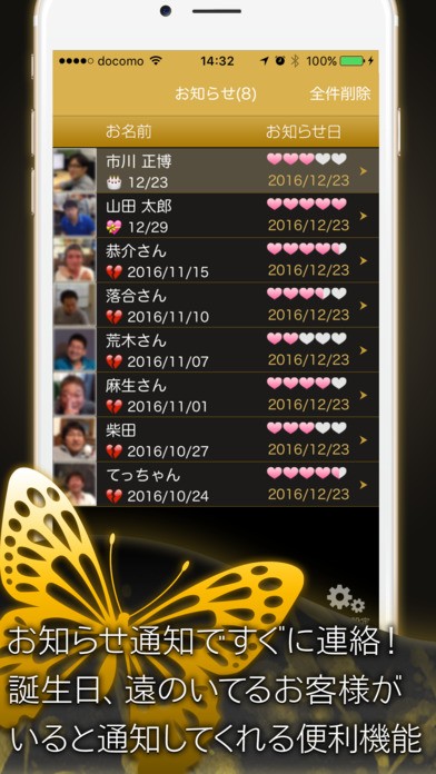 「夜蝶Diary」のカレンダーに入力したお客様との予定、顧客情報に登録された誕生日が近づくとお知らせの通知が入るので、うっかり忘れていたなんてこともなくなります。