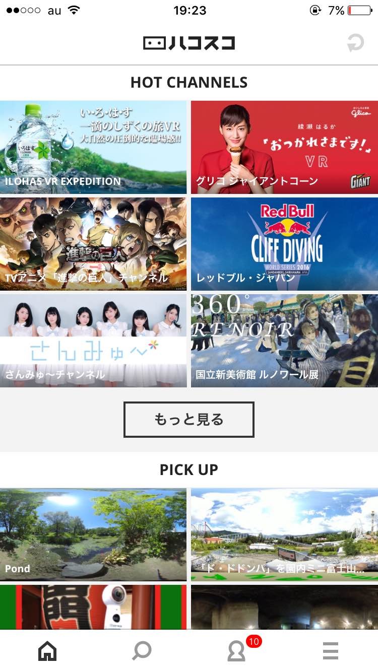 「HOT CHANNELS」「PICK UP」「POPULAR MOVIES」など項目毎に、動画や静止画が並んでいます。