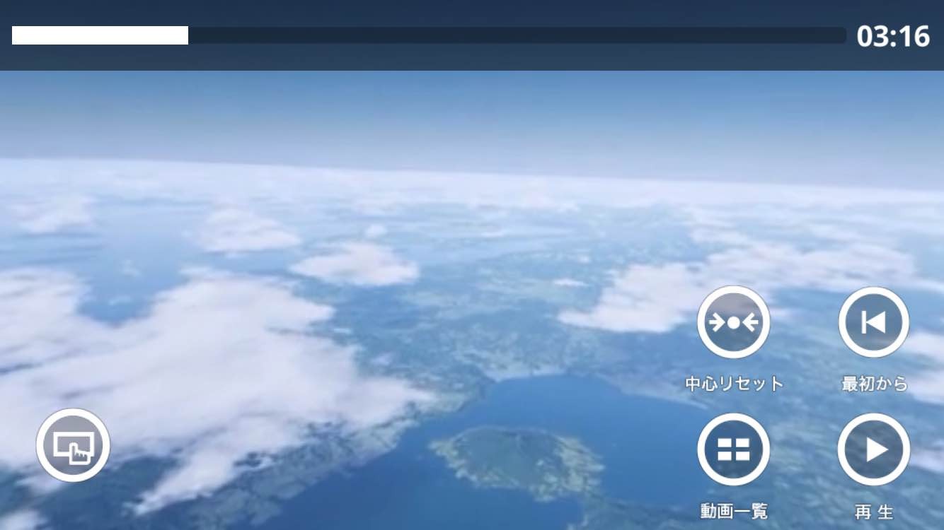 右下のアイコンは、左上から「中心リセット」「最初から」「動画一覧」「再生」とあります。