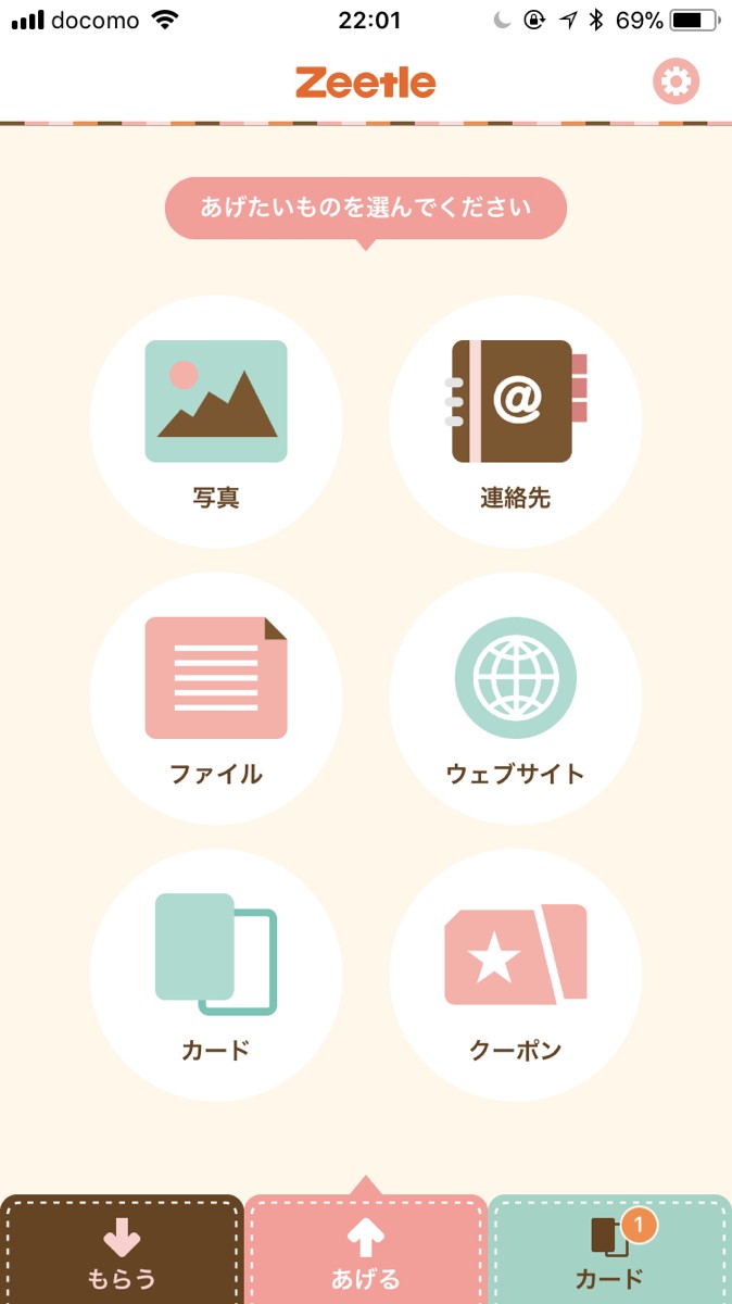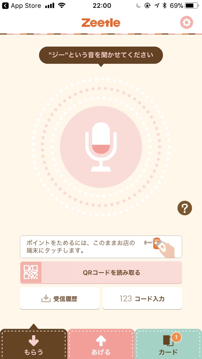 まずはアプリを起動させると、自動的にマイクの絵が描かれたメニュー画面が開きます。画面下には、「もらう」、「あげる」、「カード」という3つのメニューバーが表示されるので、データを受け取る側は「もらう」を選択しましょう。このままアプリを開いて待機しておけば、データを自動的に受信することができます。