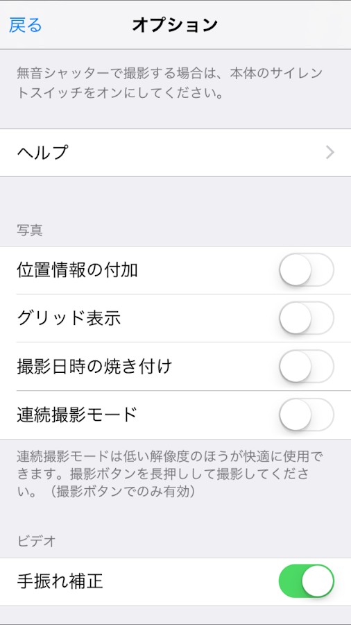 あらかじめ携帯本体のサイレントボタンをオンにしておけば、アプリを起動してすぐに無音での撮影をすることができます。