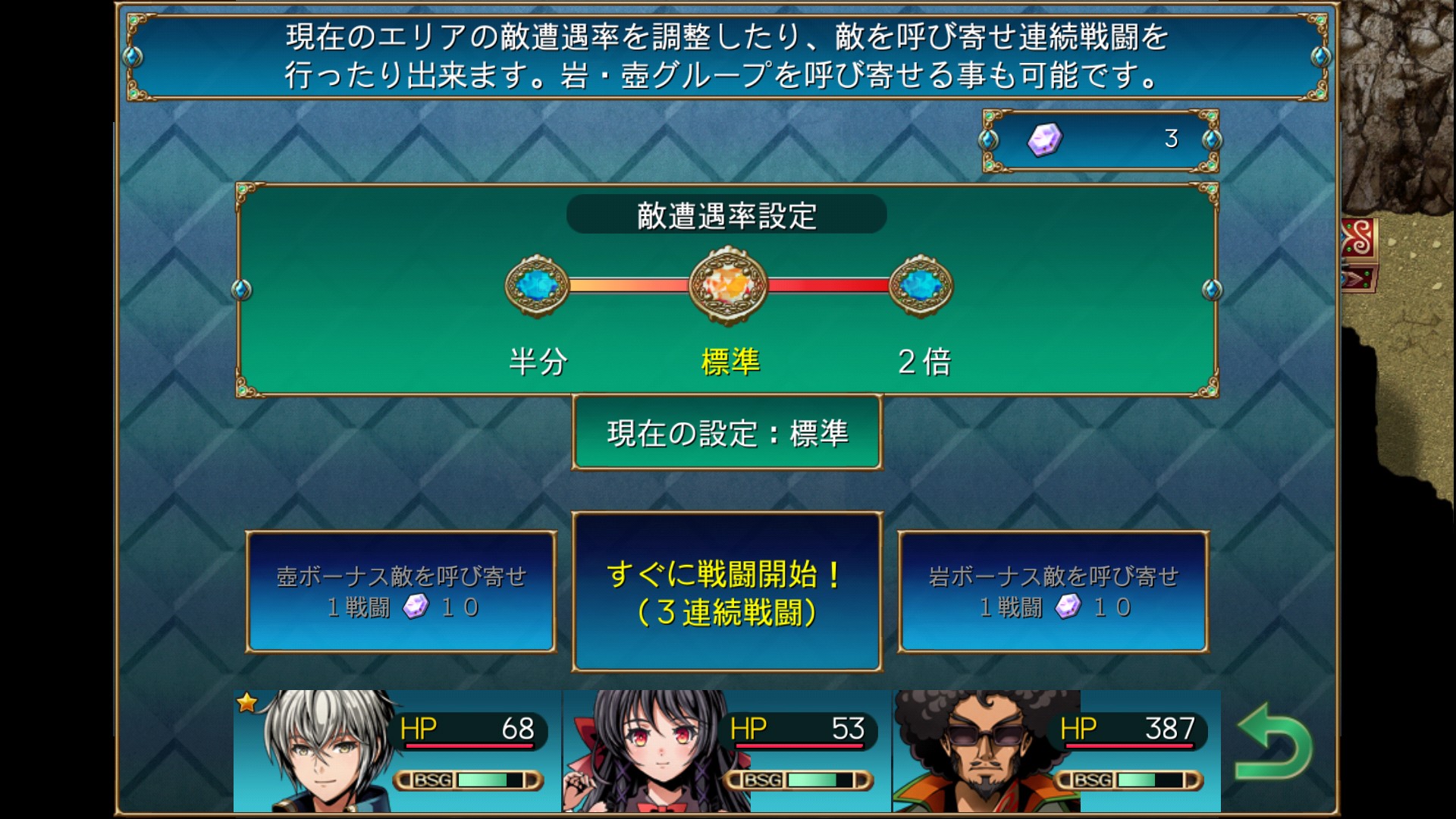 この3連バトルを繰り返していれば、わざわざ歩き回ってモンスターとエンカウントしなくてもレベルアップが可能になるため、かなり楽です。