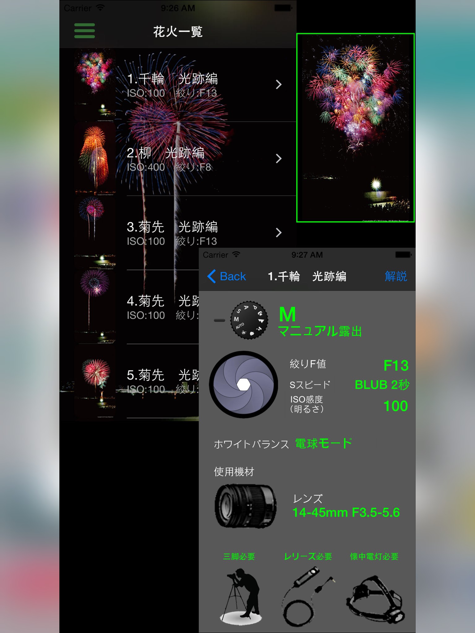 具体的には、メニューの「花火一覧」から一つ選択するとまずその撮影例が表示されます。