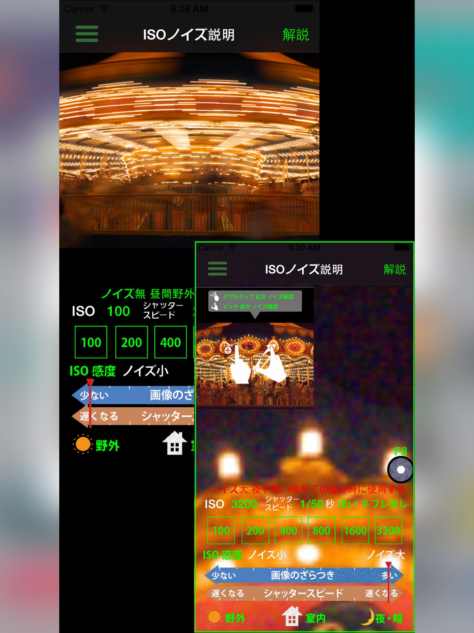 撮影例とそのマニュアル設定値のヒントまたは答えを教えてくれる、ありがたいアプリです。