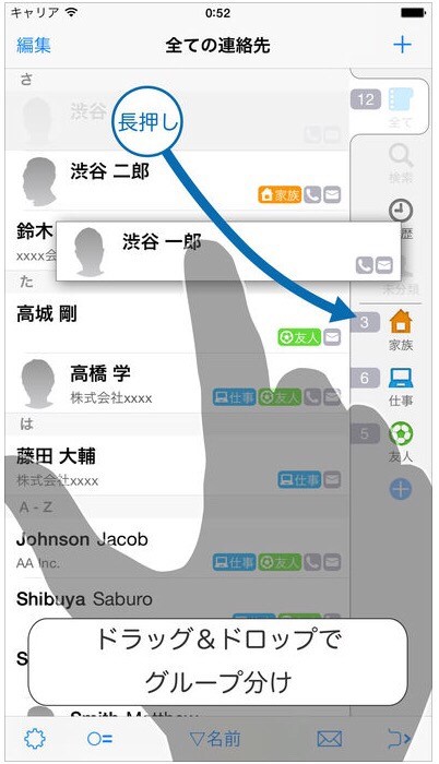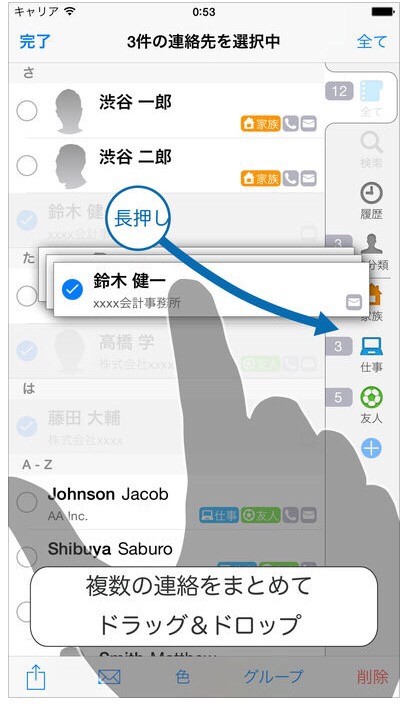 選択した連絡先を指で押しながらスライドするだけで簡単にグループ分けをすることが可能です。