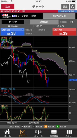 【外為オンライン】では移動平均線、指数平滑移動平均線、複合型移動平均線、ボリンジャーバンド、一目均衡表、MACD、RSI、DMI、RCI、ストキャスティクス、スローストキャスティクス、乖離率のテクニカル分析が使えます。