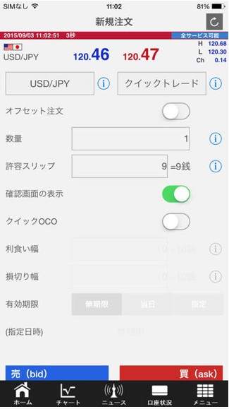 FX取引注文は成行、指値、逆指値、OCO、IFD、IFDO、トレールと全てのFX取引の注文方法が選べます。FXの注文方法全てが使えるのは取引の幅が広がり、とてもいいですね。注文方法が限定されるものもありますから、全ての注文方法が選べるのは嬉しいポイントです。