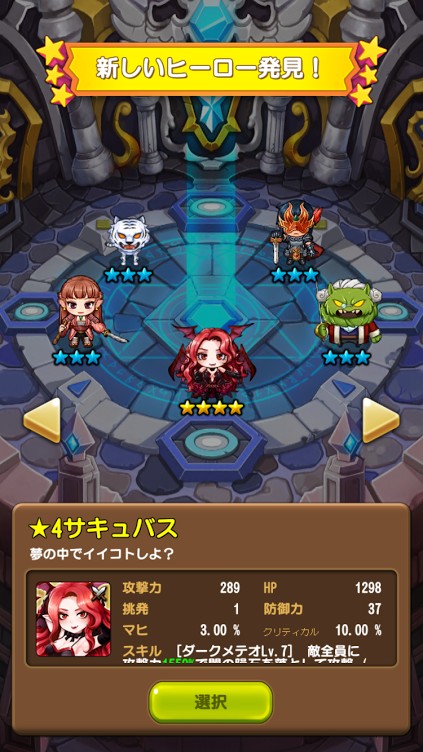 初めのチュートリアルが終わったらヒーローを選択することができます。ヒーロは全部で3人の中から自分の好きなキャラクターが選べ「ナイトキャロメット」は強力な攻撃力を持ちスキルは敵を1体攻撃することができる。ナイトキャロメットは主人公のような武装をしていてかっこいいです。攻撃力の優れたキャラクターがいい人はナイトキャロメットがおすすめです。次に「巫女武者アカツキ」は強力なクリティカルパワーを持っていてスキルは全敵員を攻撃することができます。アカツキは女の子キャラでヒロインのような可愛いキャラですよ。全体に平均的な攻撃をしたいならアカツキがおすすめです。最後は「守護機兵サロット」でチームの体力を支えることができます。スキルは敵1体を気絶させることができてチームのサポート役をしたいならサロットがおすすめです。