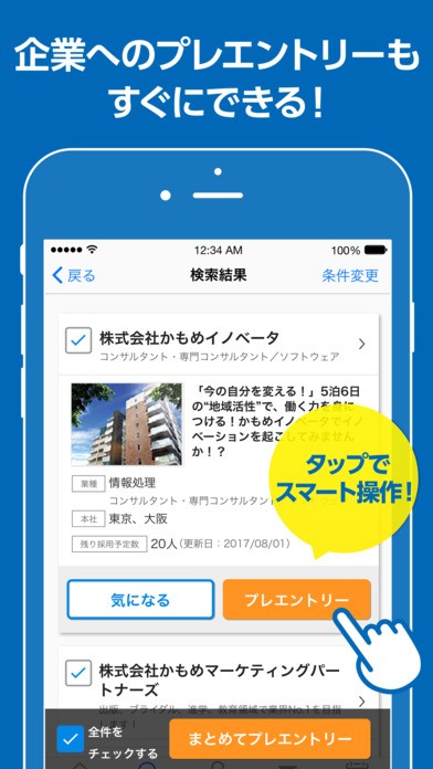 ただアプリだと、さらっとリクナビに気になる企業が登録されているか検索し、エントリーもワンタップでできる点で、ブラウザ以上にスムーズに感じると思います。