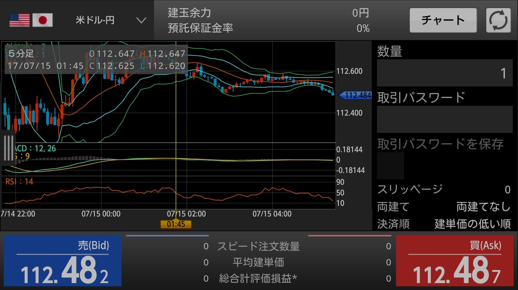 チャート画面としては、チャートエリア1面とテクニカルエリア2面が用意されており、テクニカル系指標として、