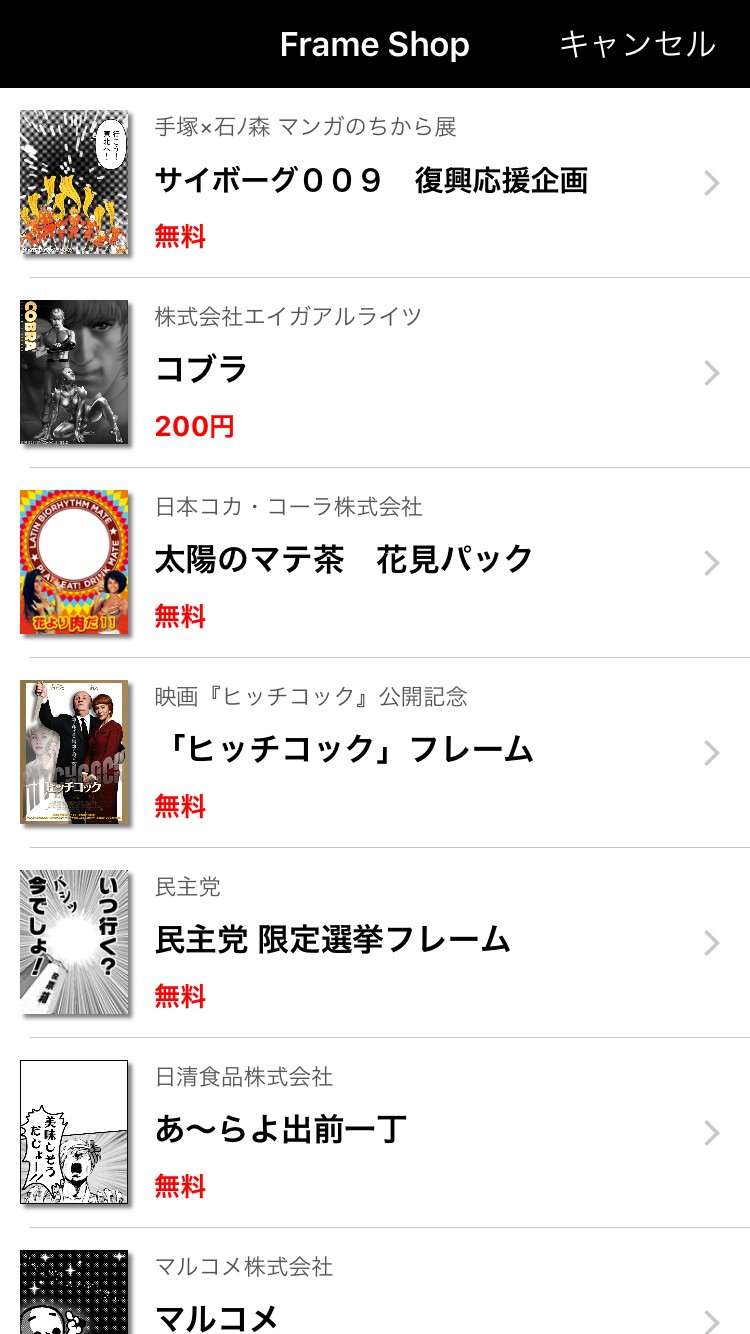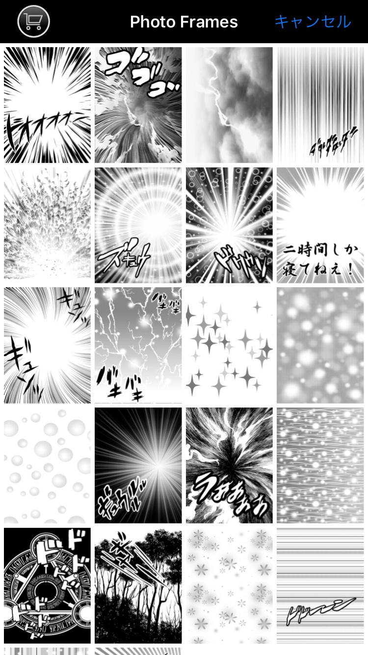 ランダムでフレームが出現します。気に入れば、そのまま丸ボタンを押して、撮影しましょう。それで完成です。漫画風の写真に自動的に変わります。仕上がりは、漫画ということもあり、白黒で出来上がってきます。(一部のフレームは、フレーム部分がカラーのものもあります)違うフレームで撮りたい場合には、左下にあるアイコンをタッチしてみてください。無料で使用できるフレームがたくさん出てきます。あとは気になるフレームを選択するだけでOKです。初期に使用できるフレーム以外にもまだまだフレームがあります。真ん中にある、カートマークのアイコンをタッチしてみましょう。