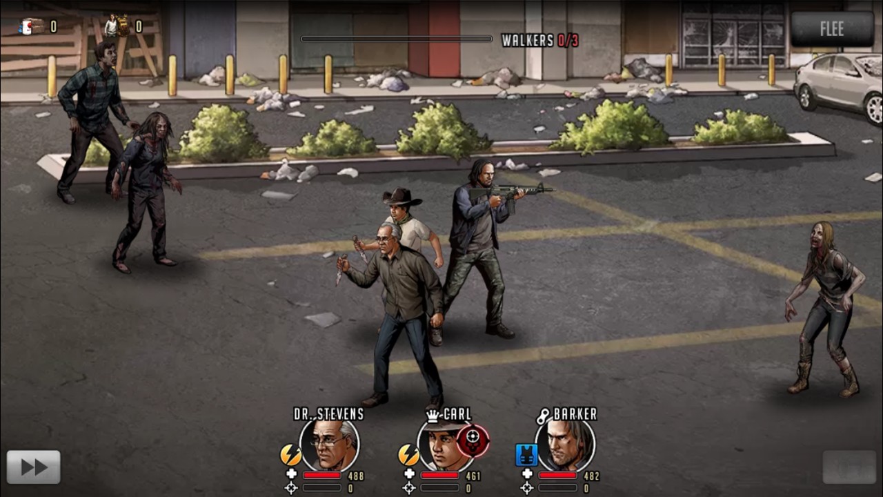 ウォーカーやサバイバーとのバトルは、ターン制で行われます。自分のチームが先に攻撃をし、それから敵のターンになります。徐々に近づいてきて攻撃をしてくるので、攻撃を食らう前に倒せるよう仲間をうまく動かして戦いましょう。