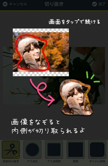 次に「自由切り抜き」をタップすると、フリーハンドで自由に写真を切り抜くことができます!