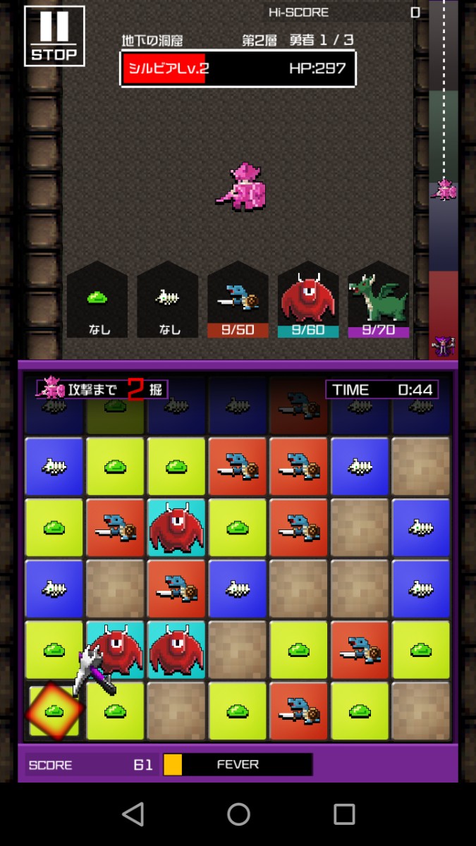土ブロックをタップして掘ると、できた隙間に上のブロックが落ちてきます。ブロックが落ちてくる前なら、掘った隙間へブロックをスライドして動かすことができるのが「勇こな」の特徴です。同じ色のブロックを縦か横に3つつなげるとブロックが消え、ブロックに応じた魔物が召喚されて勇者に攻撃することができます。