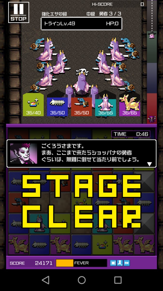 「勇こな」には魔物も勇者も戦闘中にみんな踊りだしてしまうという掟破りのフィーバーモードがあります。コンボ2つ以上でフィーバーゲージが溜まっていき、100%になるとフィーバータイム突入です!勇者はフィーバーして攻撃することすら忘れて踊り続けているのでチャンス。フィーバーモード中に魔物を呼び出し貯め込むことができ、終了と同時に召喚した全魔物が勇者に一斉攻撃するので威力は絶大です。悪の破壊神らしく姑息な手段で勝利を勝ち取りましょう。