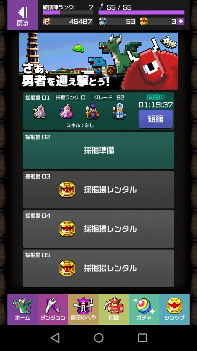 倒して捕獲した勇者を採掘に行かせて、魔物やアイテムを手に入れることができます。勇者にもスキルがあり、同じスキルの勇者を4人同時に採掘に行かせると勇者のスキルが発動します。勇者のスキルに応じて採掘してくるものも変わってくるのが面白いです。