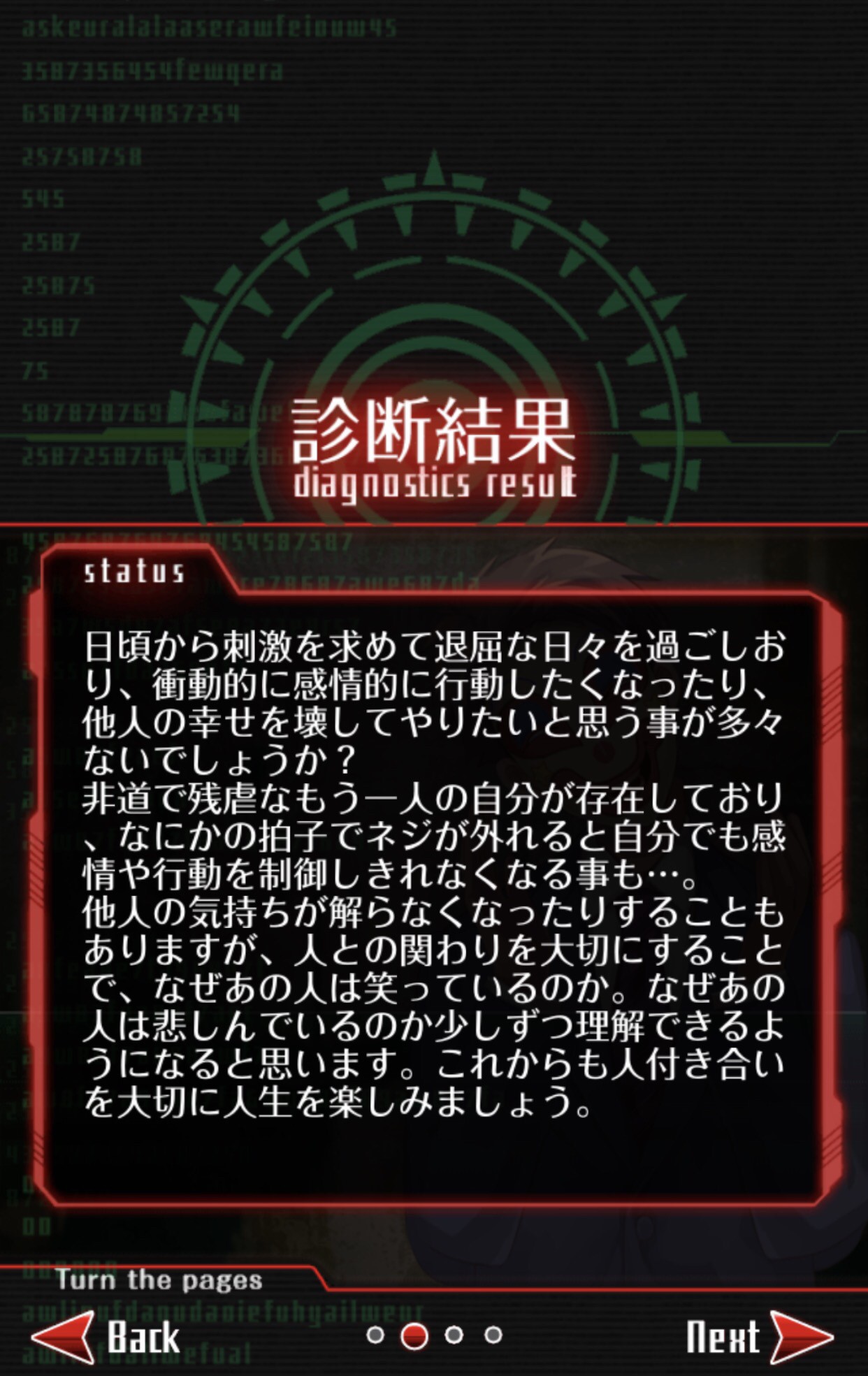 このゲームアプリでは診断結果一覧をいつでも見ることができ、診断結果は全部で6種類あります。他の診断結果が気になります!また、自分は「戯言のサイコパス」だったけれど、他の人はどんなサイコパスでどんな闇を抱えているのだろう。と、気になります。このゲームアプリを友だち同士やパーティなどでみんなでプレイすれば、きっと盛り上がること間違いありません!友だちやパーティで知り合った人に診断してもらって、どんな人なのか、この診断結果一覧を見ればすぐに分かります。診断結果がいつでも見れるのがいいですね。友だち同士、パーティなどの暇つぶしや息抜きなどにも最適なゲームアプリともいえます。