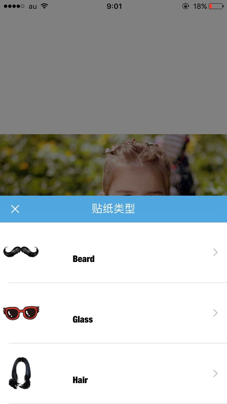 「Beard(ヒゲ)」「Glass(メガネ)」「Hair(髪型)」「Hat(帽子)」「Animal(動物)」の中からステッカーを選んでいきます!
