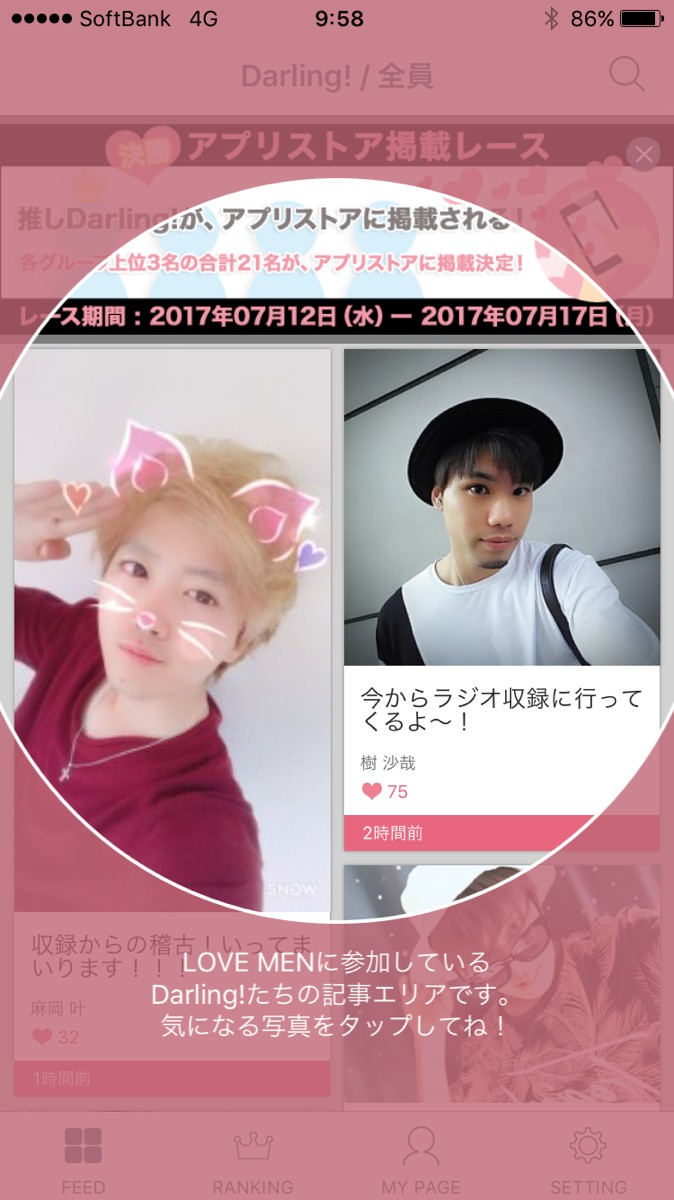 画面左下に「LOVE MEN」に参加している多くのDarling!たちの写真や簡単な記事がリアルタイムで投稿されています。