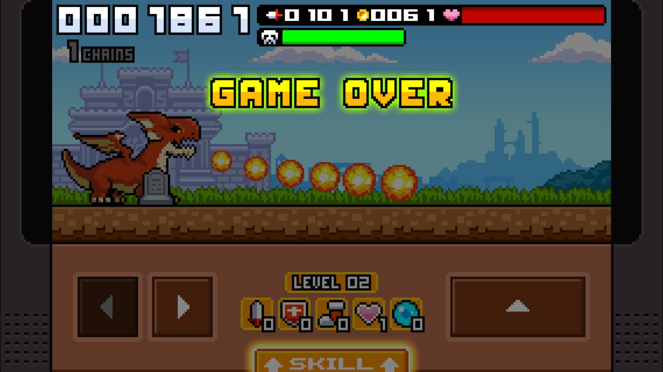 ステージ1-1のドラゴンのWEAK POINTは顔なので、ジャンプして剣先を顔に当てましょう!