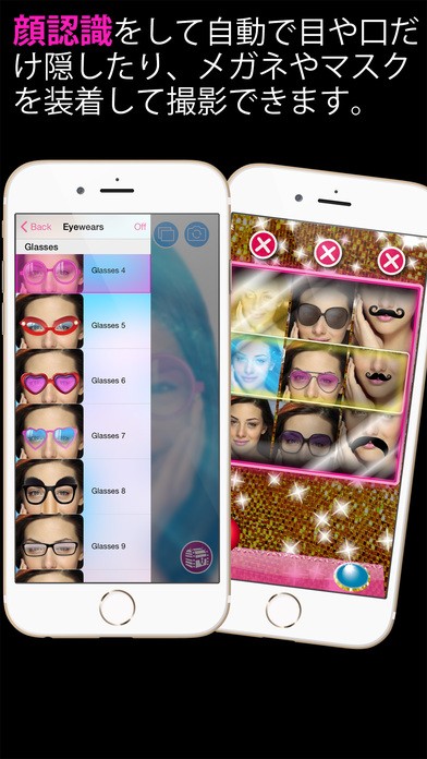 口を隠す加工が出来ます。×印、口元をぼかす、マスクをつける、ひげをつける、フルーツやスイーツで隠す、アニマルのマスクをつける、唇をつけるなどの加工が出来ます。