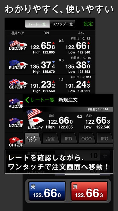 ワンタッチで注文も可能!レートの動きだけではなく4分割のチャートも見れ、それぞれの通貨の動きも一目瞭然の機能も搭載。