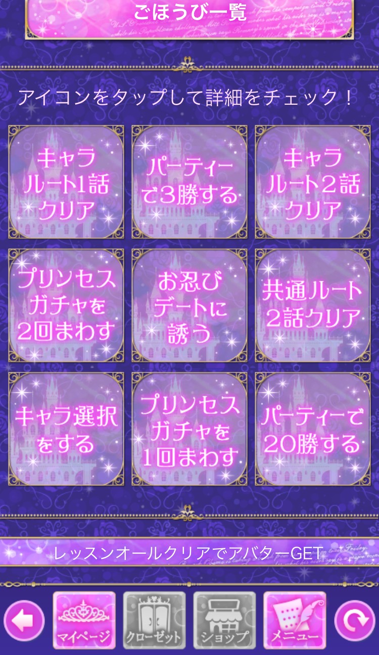 このアプリには、他のプレイヤーと対戦してストーリーに必要なプリンセス度を増やしていく「パーティー」や、アバターの洋服やお城の家具をもらえる「ガチャ」など、様々な要素があります。そのため、最初は何をしたらいいのか分からなくなってしまうかもしれません。そんな時はマイページから見ることができる初心者レッスンを確認してみましょう。お城の執事がゲームを進めていくために必要なことを教えてくれます。初心者レッスンをクリアすると、魅力のあがるアバターやラブパス、ガチャをひくのに必要なポイントなどのごほうびがもらえるので、1つずつクリアしてみてください。最後までクリアした頃には、新 王子様のプロポーズ Eternal Kissの世界にハマってしまっているはずですよ。