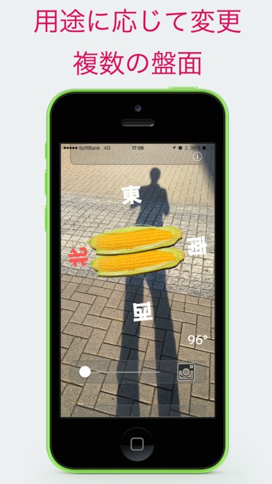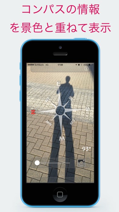 iPhoneのカメラ画像にコンパスが重なって表示されるので、自分の周りの景色が見ながらコンパスを使うことができます。