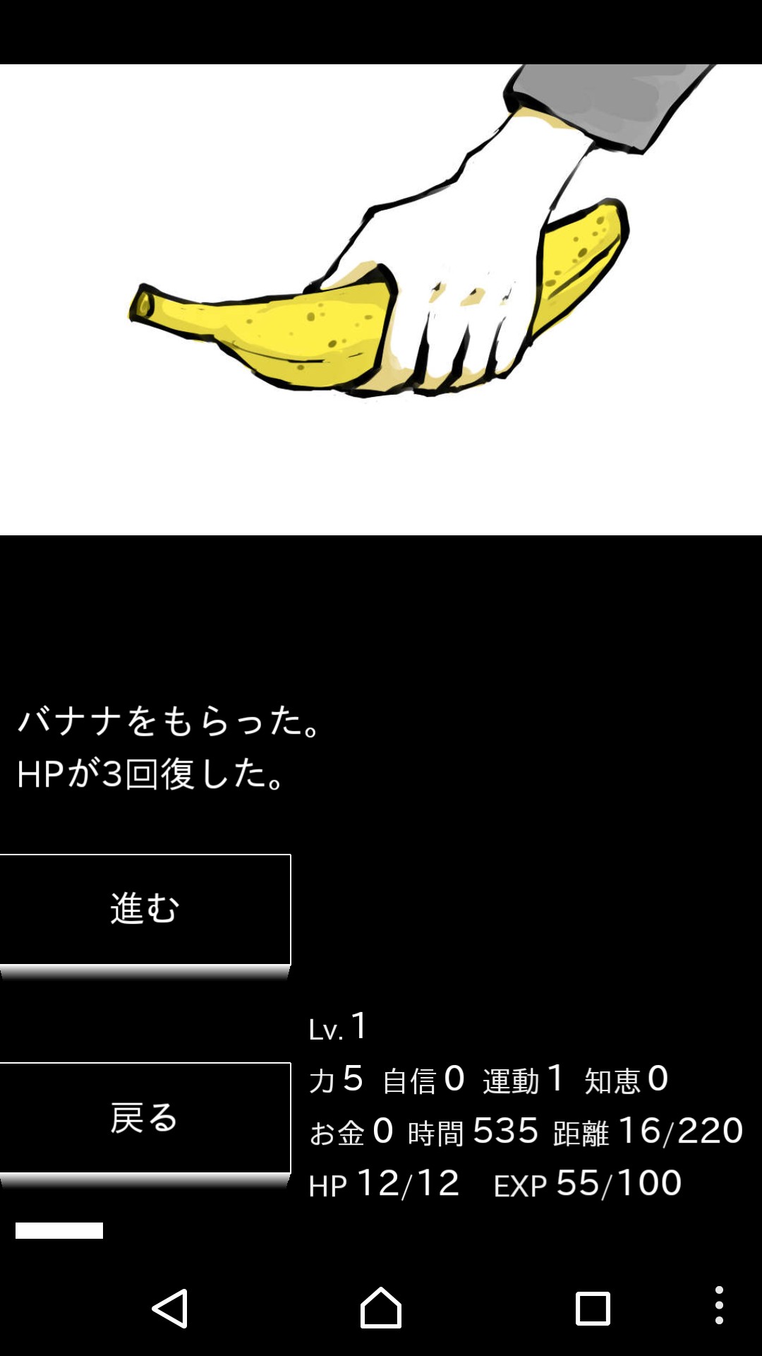 自分の部屋に戻ったら「作戦を練る」>「探索結果」を見てみてください。距離がどのくらいでどのような試練やバトルが発生するかが記録されています。これを参考に、レベルが上がるまではあまり先へ行かず、「戻る」を活用してなるべく経験値をため、レベルを上げてから先に進みましょう。