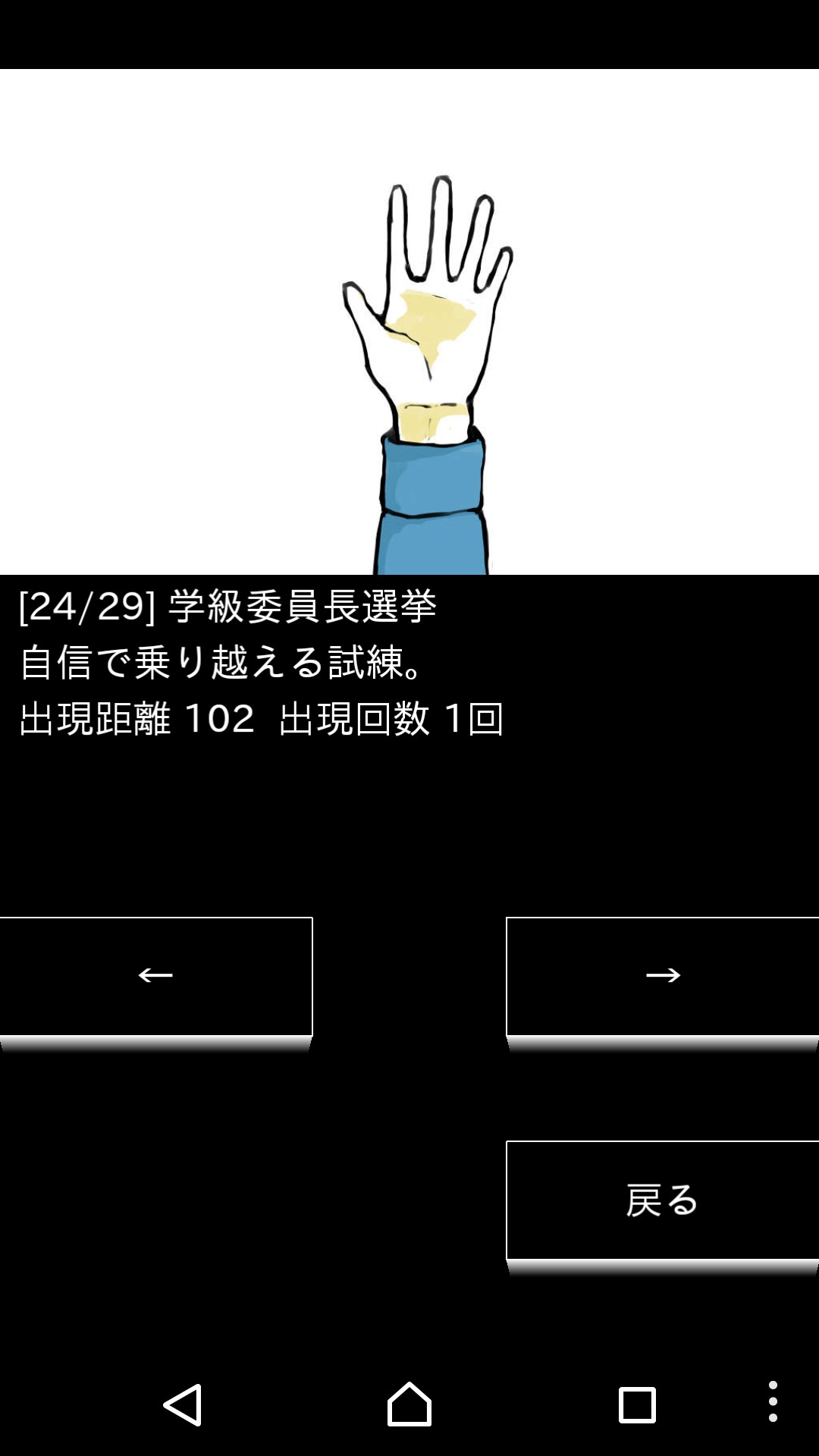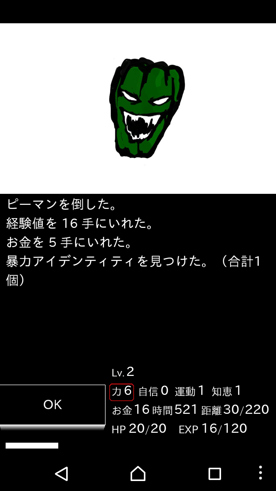 真っ白な世界を進んでいくと、さまざまなイベントが発生します。HPを回復したり、逆に下げたりする強制イベントがある他、たとえば第一話「少年サバイバル」であれば、「滑り台を滑り降りる」、「積み木を積み上げる」…など、やるのもやらないのも自由なイベントもあります。こうしたイベントでは、基本的には、「力」「自信」「運動」「知恵」の4つのパラメーターのいずれかが成否を左右しますが(そのパラメーターが赤枠で囲まれます)、運の要素もかなり加味されます。失敗するとダメージを受けますが、成功すると経験値が手に入り、場合によってはパラメーターがアップすることもあります。