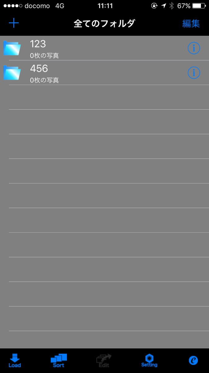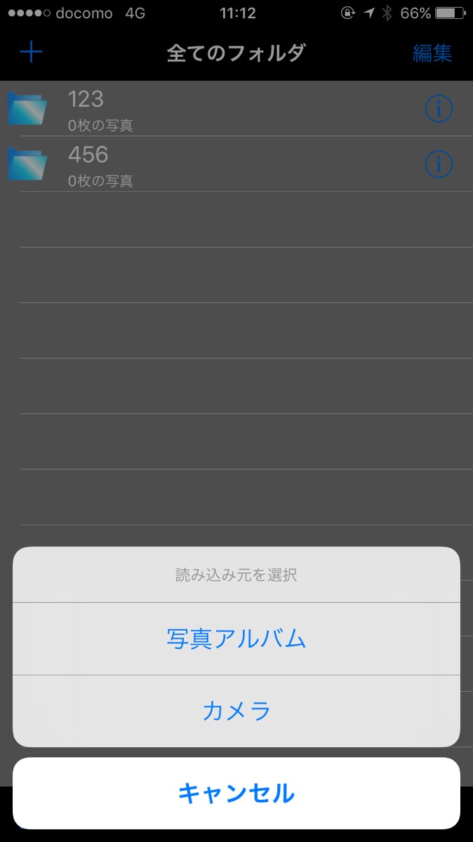 3.作成したフォルダを選択して画面下の「Load」アイコンから「写真アルバム」または「カメラ」を選択して写真を取り込む