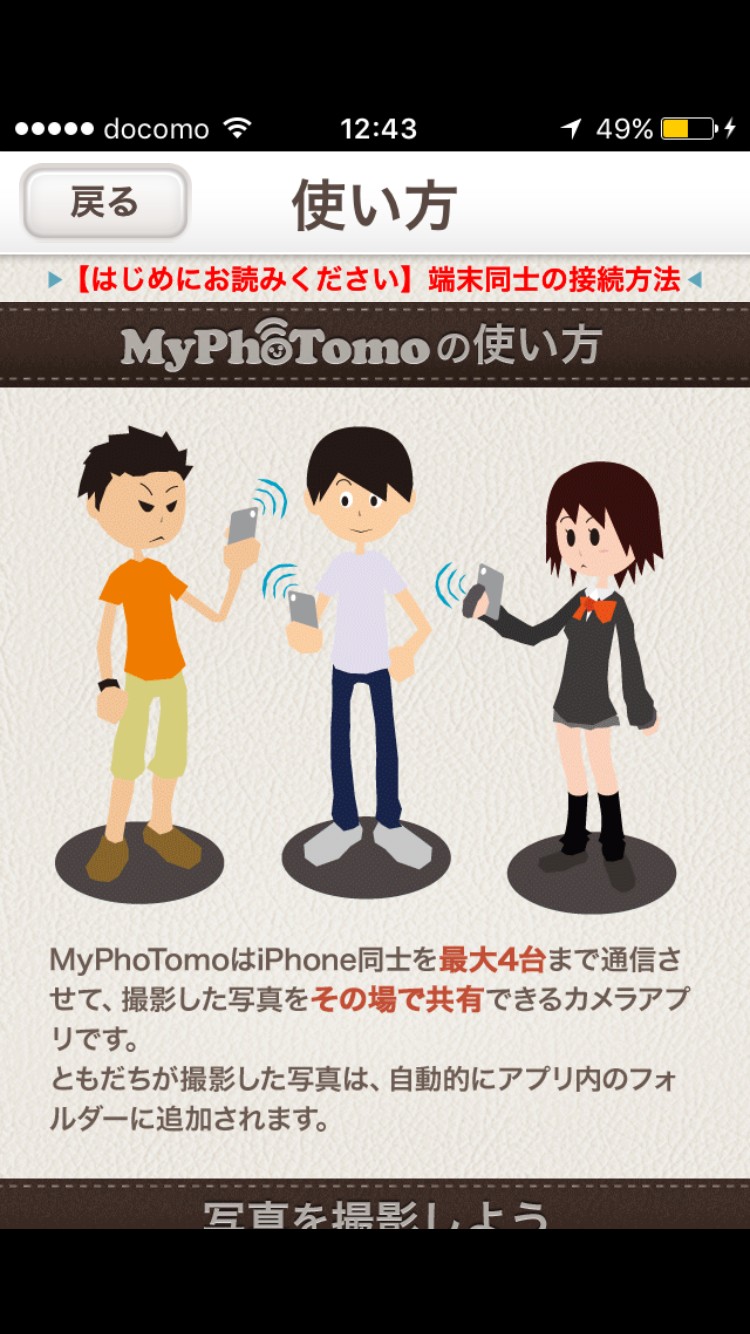 1. 「MyPhoTomo(マイフォトモ)」は最大4台のiPhoneを同時接続。その場で思い出を共有できます。
