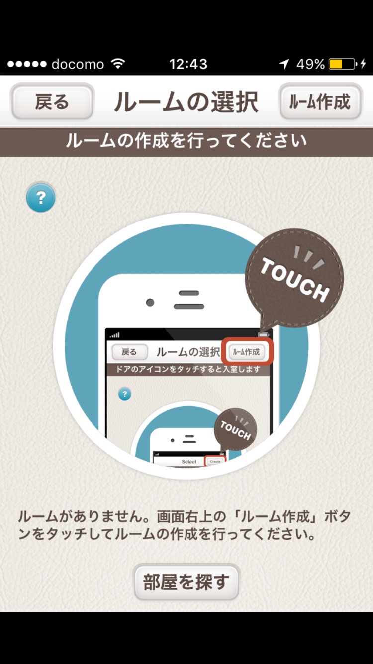3.「部屋を探す」をタップし、オーナーが作成したルームへ入室