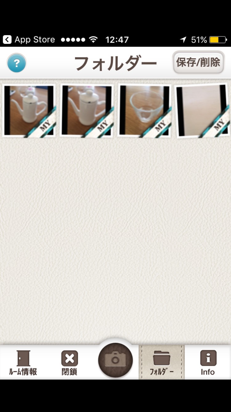 という点です。アプリで写真を共有するためには、まず友達の代表がルームを作成する必要があります。ルームに入室した人だけが、写真を閲覧できる仕組みです。アプリを起動して写真を撮影するだけで、ルームに入室している全員のフォルダーに自動的に写真が表示されます。それぞれが撮影した写真を1か所にまとめ、一瞬で共有できるのです。ルームのフォルダー内の写真は、欲しいものだけ自分のiPhoneに保存できます。保存したものは、リストから消えるので、重複して保存せずに済むのも「マイフォトモ」の便利なポイントです。