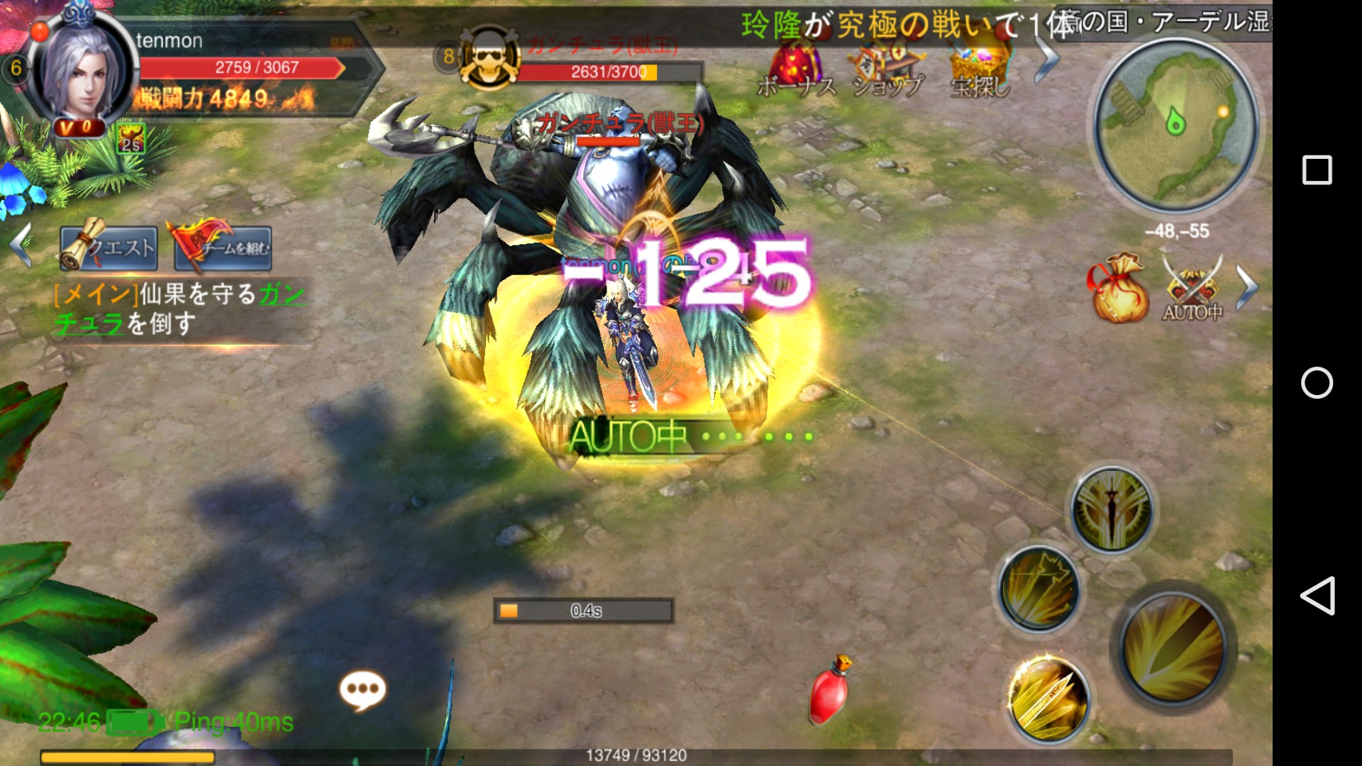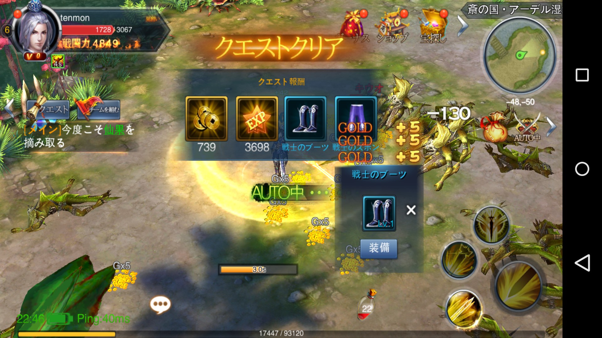 クエストがないときはオートを押しておくと勝手に敵を倒し、お金と経験値を稼いでくれます。天子伝説は魔物のわきが良く、倒しても次から次へと大量にわいてきます。